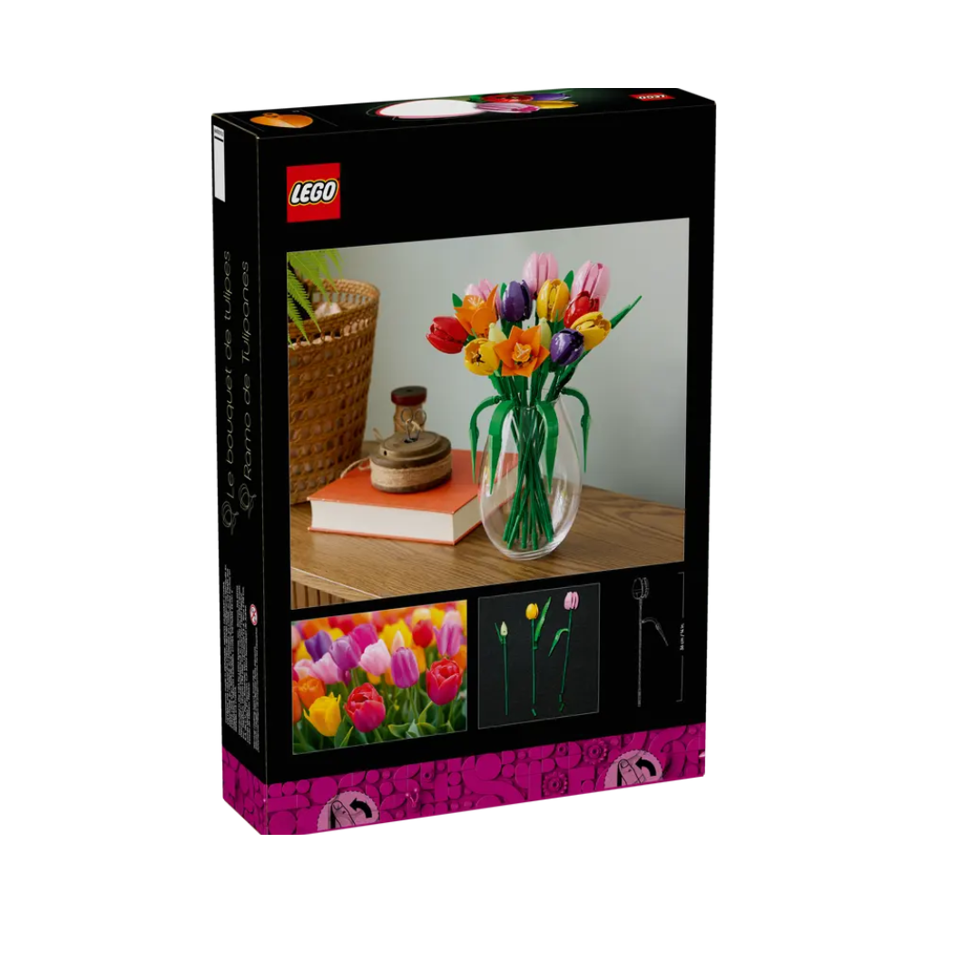 5 TULIPANES LEGO®: El ramo incluye 5 variedades de tulipanes en diversos colores y fases de floración; hay capullos verdes, tulipanes violetas cerrados y tulipanes rojos, amarillos y rosas abiertos