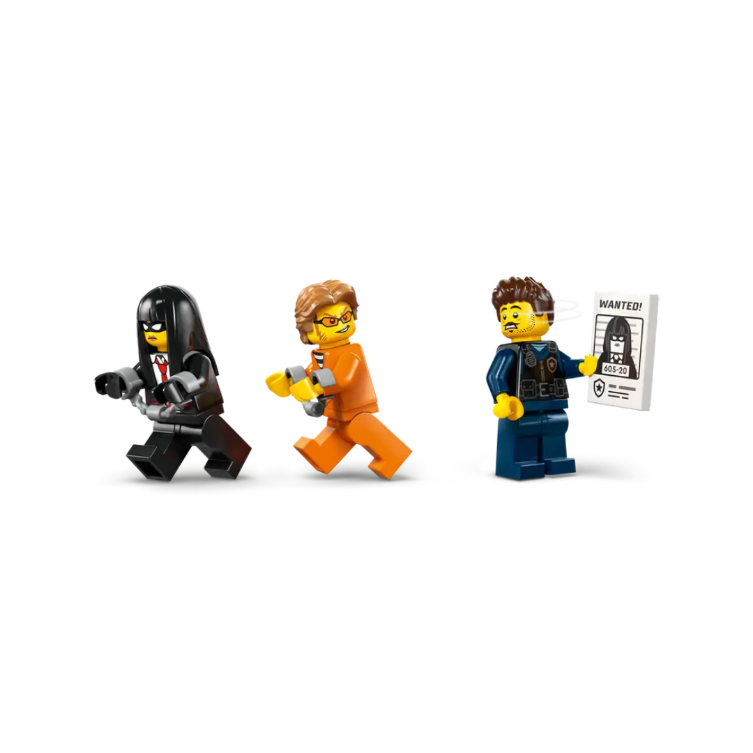 FUGAS DE LA CÁRCEL: Los niños pueden colocar la minifigura del policía conductor en la furgoneta de juguete, encerrar a un ladrón en la celda y usar el gancho del modelo de moto para arrancar la puerta de la celda y protagonizar una épica fuga.