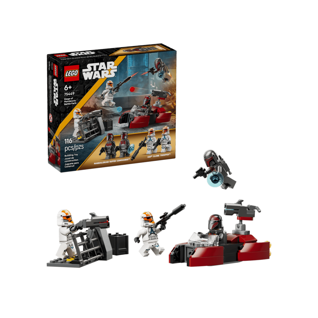 Regala a tu peque un fabuloso Pack de Combate (75449) para interpretar su propia versión del impactante asedio de Mandalore de Star Wars: Las Guerras Clon! Este set de construcción incluye 4 minifiguras LEGO® Star Wars™: 2 super comandos Mandalorianos y 2 versiones de soldados clon de la 332 de Ahsoka, un speeder Mandaloriano, la barricada de los soldados clon y accesorios.