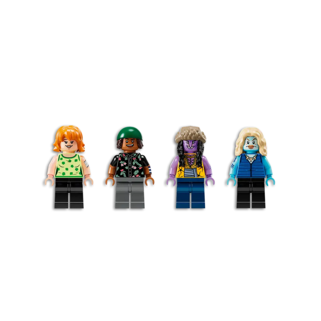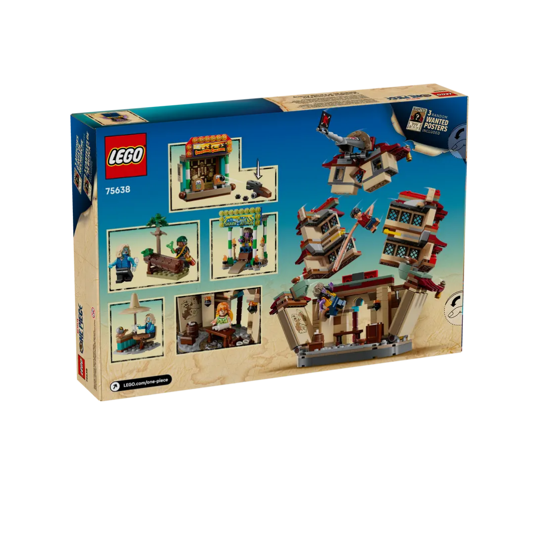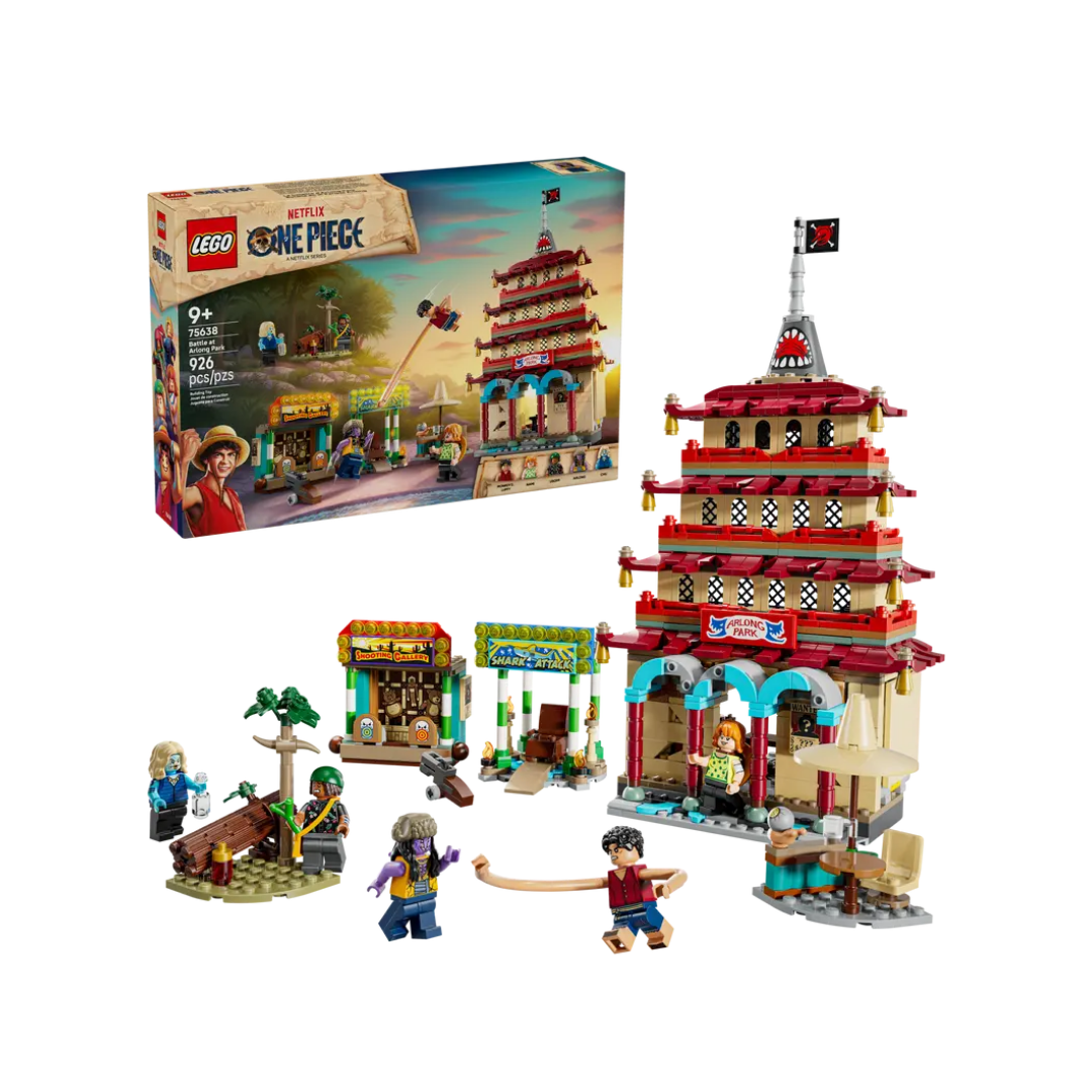 El set de construcción incluye minifiguras de Luffy (que cuenta con piezas para alargarle los brazos), Nami, Usopp, Arlong y Chu. Los peques pueden hacer que la pagoda se derrumbe dándole un toque firme por arriba, disparar a los divertidos blancos del puesto de tiro y colocar al infame Arlong en un trono dentro de la atracción Shark Attack. Luego pueden pedirle a Chu una bebida en la caseta y encontrar una botella de kétchup en el bosque. Además, el juego contiene cañones que disparan y accesorios, como 3 carteles de “Se busca”. Para disfrutar también de diversión en modo digital, los constructores pueden usar la intuitiva app LEGO Builder.
