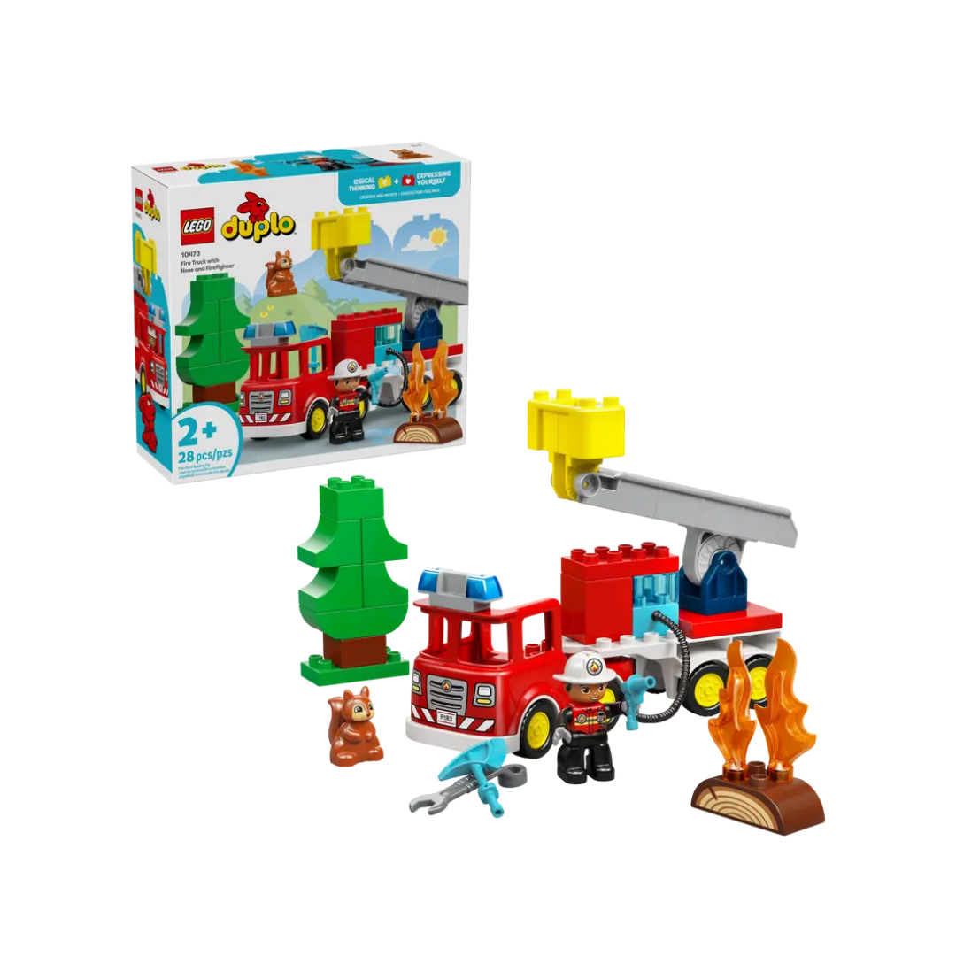 JUGUETE LEGO® DUPLO® DE BOMBEROS: ¡Este juguete de interpretación permite a los preescolares imaginar que son héroes cotidianos! Usando la escalera, apagan las llamas del tronco con la manguera; mientras, una ardilla contempla la escena desde lejos.