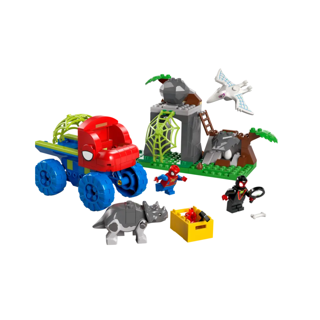 Este juego LEGO® trae minifiguras de Spidey y Miles “Spin” Morales, además de 2 figuras de dinosaurios: Spider Fantasma como Pterodáctilo y Rino como Triceratops. Cuenta también con el Todoterreno Dinosaurio LEGO de Spidey (con una gran telaraña en la parte trasera), una roca que cae al accionar un gatillo, un huevo de dinosaurio y una telaraña que se puede bajar para atrapar al villano. Viene con instrucciones en forma de colorida historia visual, y las bolsas contienen ladrillos y un ladrillo para principiantes que facilita y agiliza la construcción.