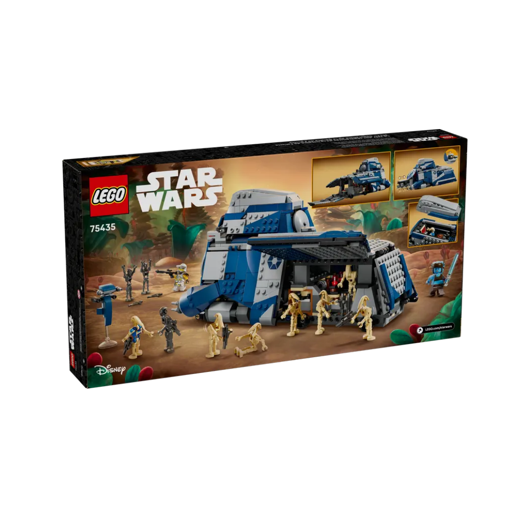Preparado para la acción: El MTT tiene ruedas ocultas para desplazarse con suavidad, cabina de pilotaje, 2 cañones que disparan, un speeder STAP en el compartimento posterior y paneles laterales que se abren hacia arriba para acceder al interior.