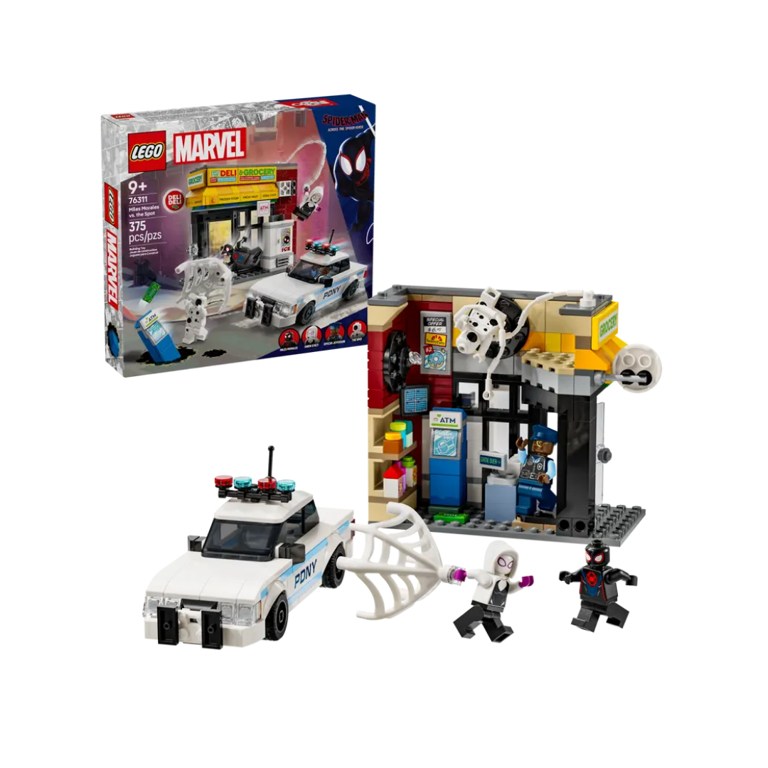 El set de Spider-Man viene con 4 minifiguras: Miles Morales, Mancha, Gwen Stacy y el agente Jefferson. El minisúper cuenta con una función para hacer explotar la pared y extraer así el cajero automático. Los accesorios incluyen una cuerda arácnida larga y flexible y una telaraña flexible lo bastante larga como para atrapar a una minifigura. El coche de policía se abre y permite colocar 2 minifiguras en su interior. Para disfrutar de diversión digital, los constructores pueden acercar y girar sus modelos en 3D y controlar su avance con la intuitiva app LEGO Builder.