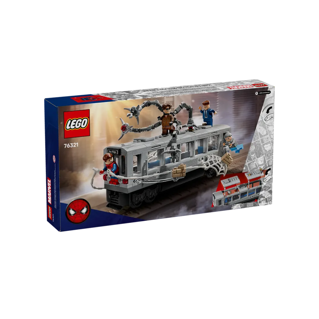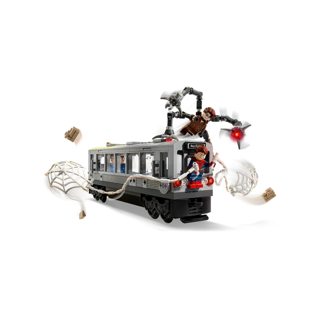 El set se basa en una emblemática escena de la película de Marvel Studios Spider-Man 2. Incluye 4 minifiguras: J. Jonah Jameson, tía May, Spider-Man y Doc Ock. La minifigura de Spider-Man cuenta con cabezas intercambiables (con y sin máscara) y una gran telaraña que se puede fijar al tren. La minifigura de Doc Ock tiene 4 tentáculos articulados, 2 con elementos que representan rayos láser y 2 con clips para engancharlos al tren. El techo se quita para facilitar el acceso al interior, con espacio para sentar a un pasajero en formato de minifigura. La app LEGO Builder ayuda a los constructores a construir este set de 393 piezas.