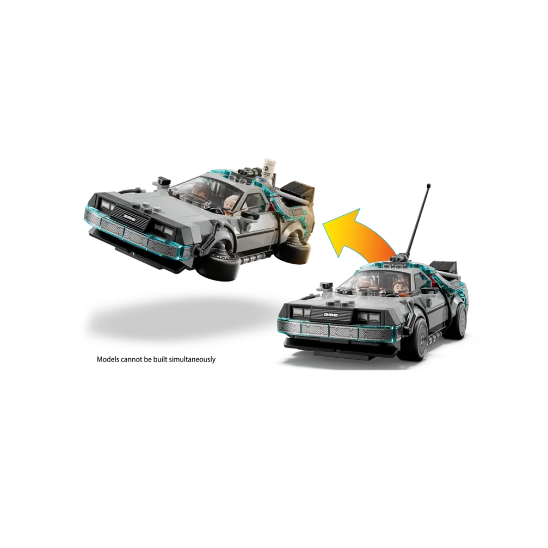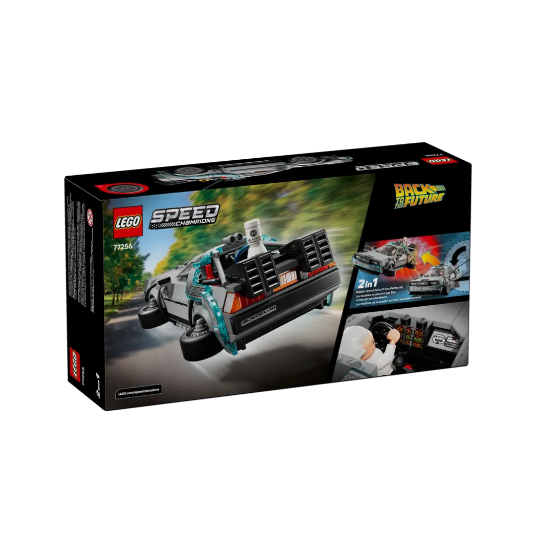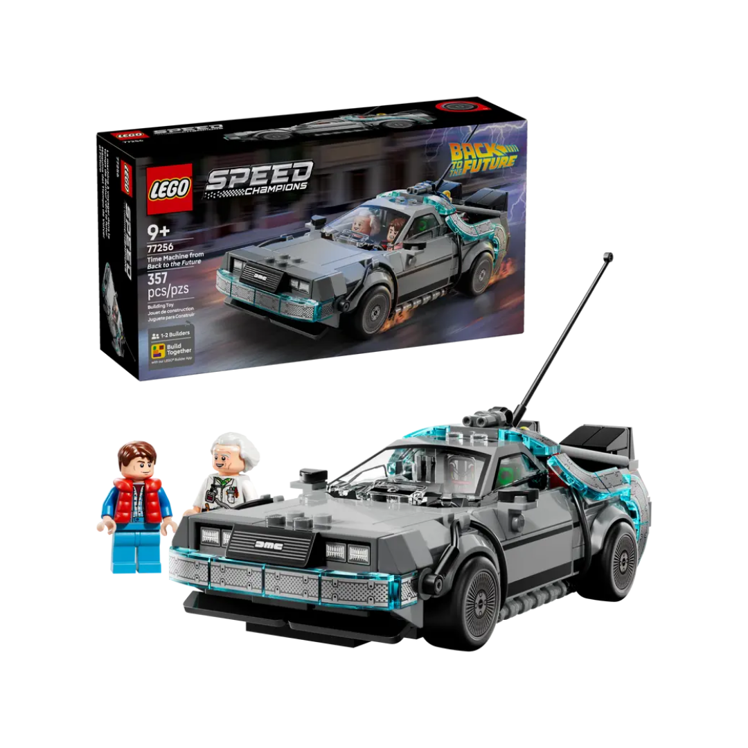 El kit LEGO® Speed Champions Máquina del Tiempo de Regreso al Futuro (77256) permite a los niños a partir de 9 años construir, exponer y recrear la acción de la popular franquicia cinematográfica. Este coche de juguete incorpora famosos detalles del modelo que aparece en las películas. Construye este emblemático coche con pararrayos y matrícula de California, como en el primer largometraje, antes de volver a construirlo en la versión voladora de la segunda entrega, con Mr. Fusión, una matrícula naranja y ruedas abatibles. Ambas versiones disponen de orificios de ventilación traseros, habitáculo, condensador de fluzo y calculadora del tiempo. Para ofrecer un valor de juego añadido, el set viene con 2 minifiguras: Doc Brown y Marty McFly, que podrás colocar dentro del habitáculo. Este set es un gran regalo para niños y adultos nostálgicos, quienes, gracias a la app LEGO Builder, podrán construir con confianza con instrucciones digitales fáciles de seguir. El set contiene 357 piezas.
